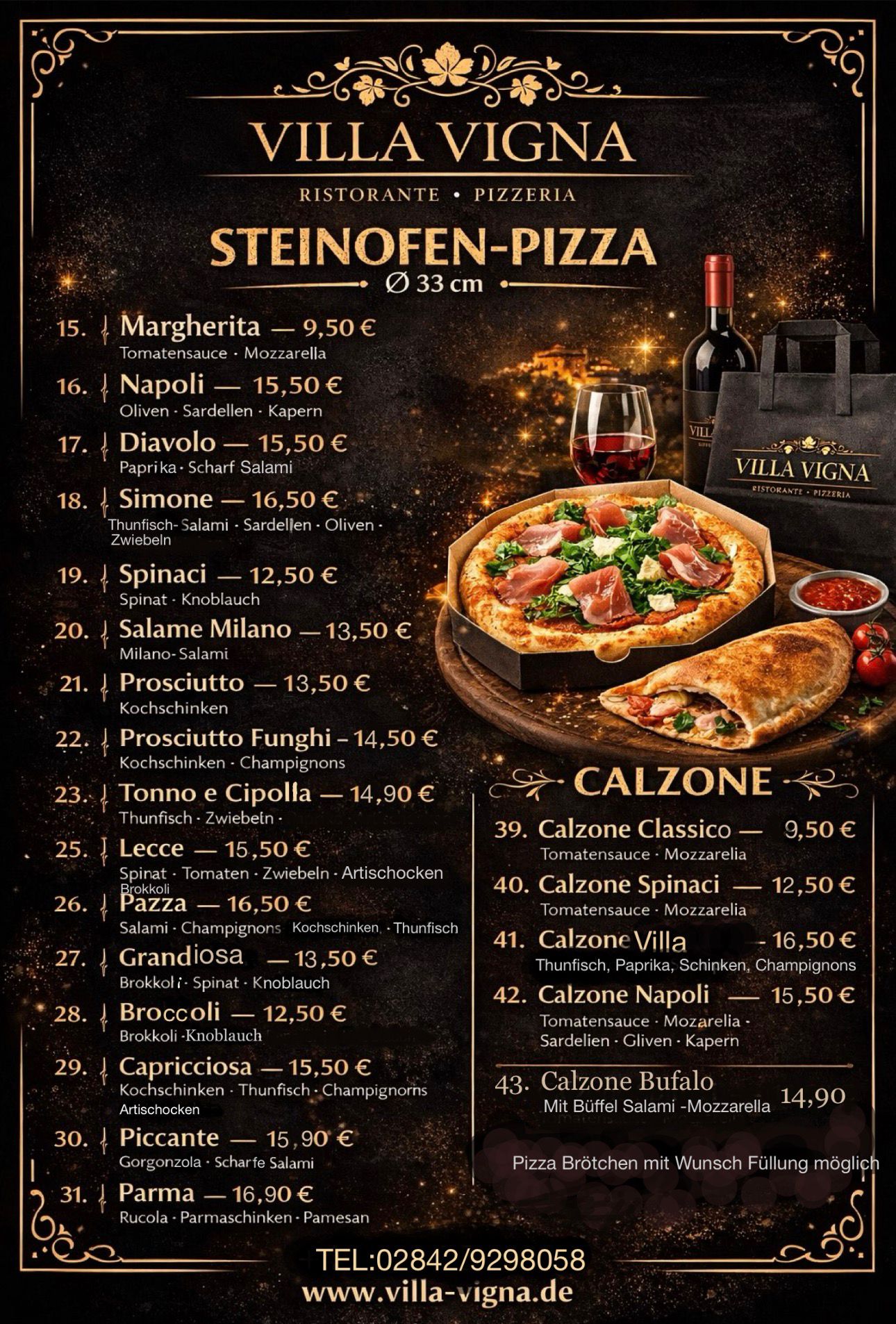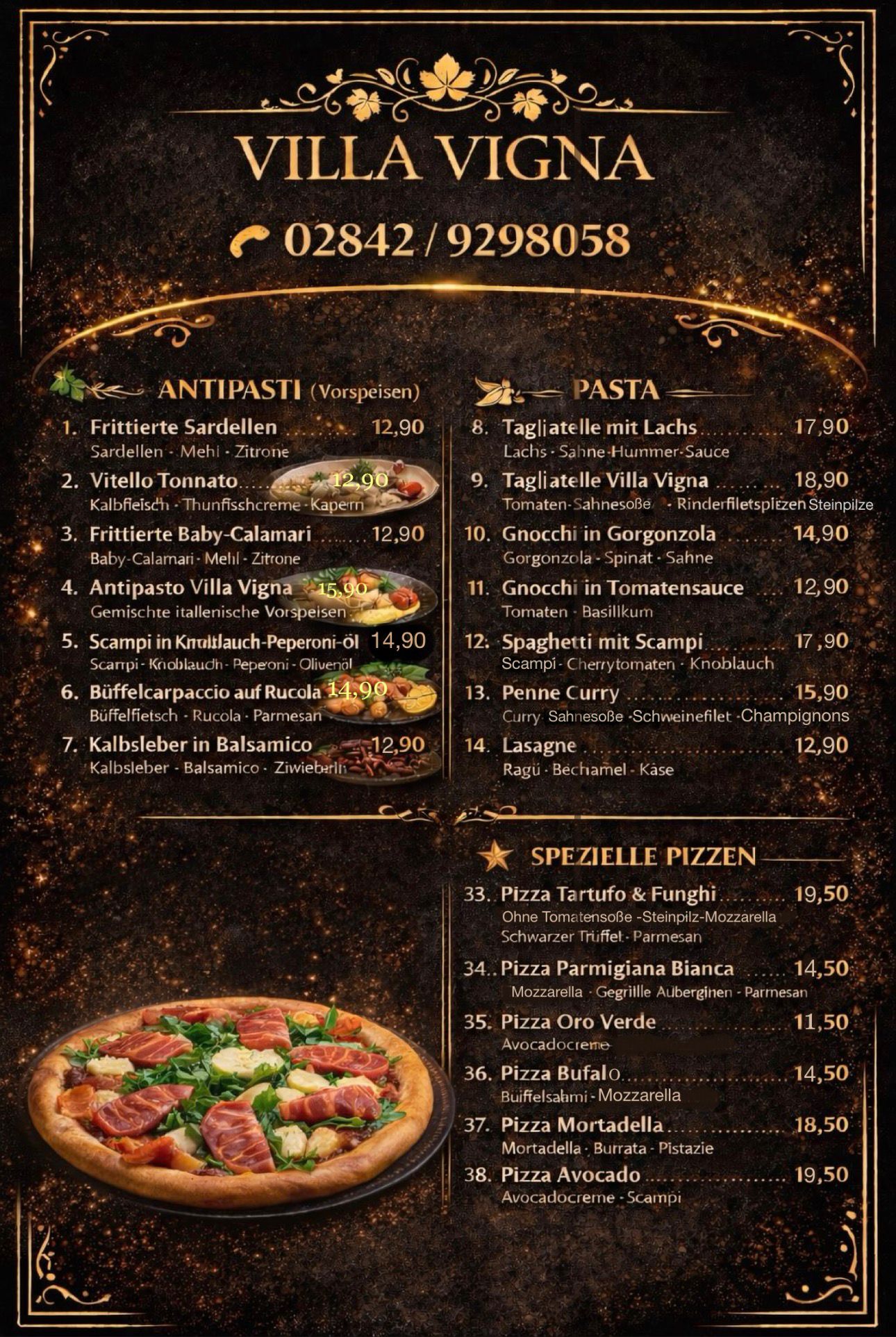 in Saalhoff, Kamp-Lintfort! Die Familie Vigna kreiert täglich eine frische und vielfältige Speisekarte mit rund 20 sorgfältig ausgewählten Gerichten. Von Büffel-Mozzarella über Pulpo-Carpaccio bis zu Tagliatelle „Villa Vigna“ mit Steinpilzen und Rinderfilet – unsere täglich wechselnden Angebote überraschen und begeistern. Dabei setzen wir nicht nur auf exzellente Speisen, sondern auch auf eine erlesene Auswahl italienischer Weine und authentischen Espresso. Das Ristorante liegt etwas abseits, ist jedoch mehr als einen Besuch wert, denn wir bieten mehr als nur Pasta und Pizza. Reservieren Sie besonders an Wochenenden, um Ihr kulinarisches Erlebnis zu sichern. Genießen Sie eine authentische Reise durch die italienische Küche im Ristorante Villa Vigna – wo Frische, Vielfalt, Leidenschaft und die Aromen von erlesenen Weinen und Espresso aufeinandertreffen.
